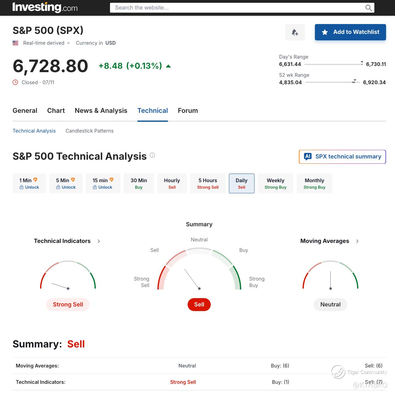 When examining the technical analysis indicators for the S&P 500 on a daily interval, it is evident that the overall outlook is currently bearish. Out of a total of 20 technical indicators considered, 7 are signalling a “buy” rating, while 13 are indicating a “sell” rating. This distribution suggests that the market sentiment leans more toward selling pressure at this time. As a result, the aggregated technical analysis for the S&P 500 reflects a “sell” rating, highlighting caution for investors in the short term.