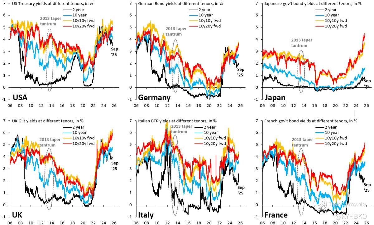 We’re in a global debt crisis. To see that, don’t look at 30-year yields, which get pulled down by falling short-term yields. Look at 10y20y forward yields (red) that strip out short-term yields. Those are up everywhere and at alarming levels in places like Japan, UK and France. - X user Robin Brooks