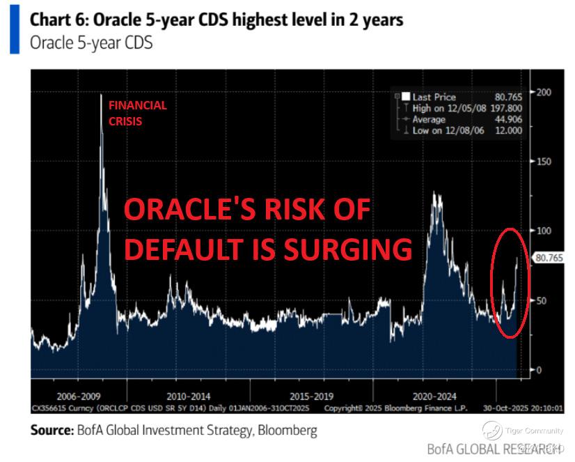 Oracle’s 5-year Credit Default Swap spiked to 81 basis pts, the highest in 2 YEARS. Credit traders are buying protection against Oracle defaulting on its debt at the fastest pace since 2023. Can Oracle sustain its aggressive AI buildout? - X user Global Markets Investor