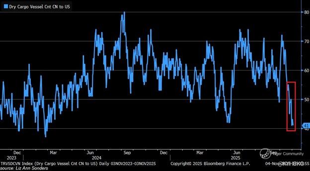 Container shipping traffic from China to the US is in freefall. The cargo vessel count from China to the US has dropped to 41, the lowest since February 2024. The number of large cargo ships has declined by -30, or 42%, over the last 3 weeks. This is well below the average of ~60 over the last 18 months. As a result, total cargo volumes have HALVED to ~300,000 TEUs, where one TEU equals a standard shipping container, the lowest since at least January 2024. Combined cargo volumes from all major Asian exporters have also fallen to ~700,000 TEUs, the lowest since February 2024. U.S.-China trade is rapidly slowing. - X user The Kobeissi Letter