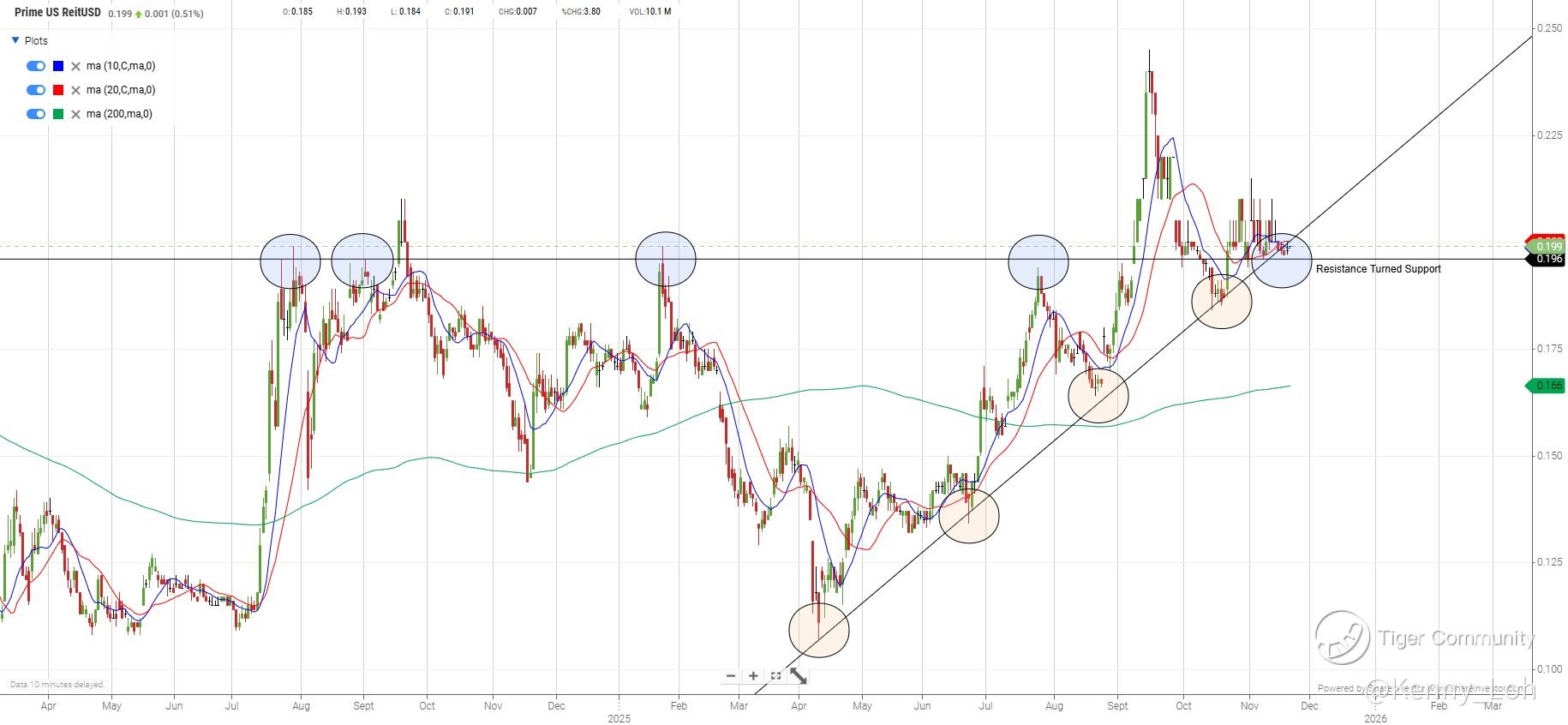 The provided daily chart $Prime US ReitUSD(OXMU.SI)$ , running from May to November 2025, illustrates a significant uptrend after a period of consolidation.