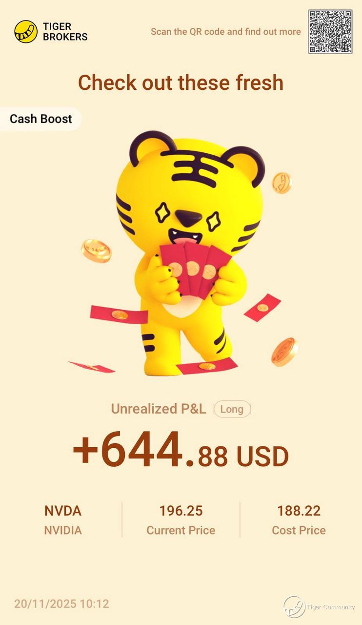 $NVIDIA(NVDA)$ 's earnings are on fire! Revenue and profits smashed records, with even stronger guidance – AI demand shows no signs of slowing. Cloud providers and model makers are still hoarding computing power. With its CUDA ecosystem and hardware dominance, NVIDIA's position as the essential "arms dealer" in this AI race is rock-solid. Took some profits, but staying long! Shoutout to recent Contra 688 offer – snagged SGD 688 in Cash Boost vouchers as a new user. Sweet deal!