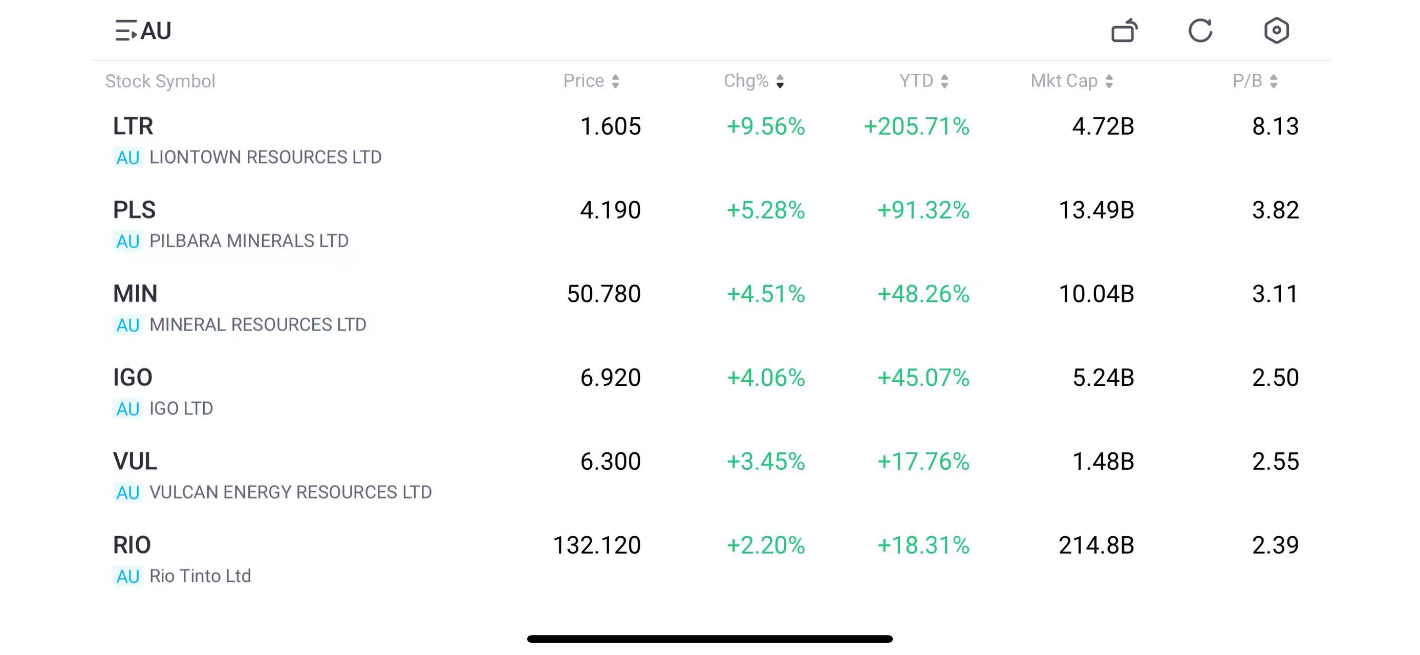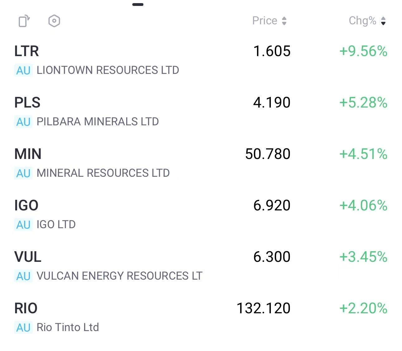 Other major lithium names also rallied sharply: $LIONTOWN RESOURCES LTD(LTR.AU)$ +9.56, $MINERAL RESOURCES LTD(MIN.AU)$ +4.51%, $IGO LTD(IGO.AU)$ +4.06, $VULCAN ENERGY RESOURCES LTD(VUL.AU)$ +3.45%, and $Rio Tinto Ltd(RIO.AU)$ +2.22%.