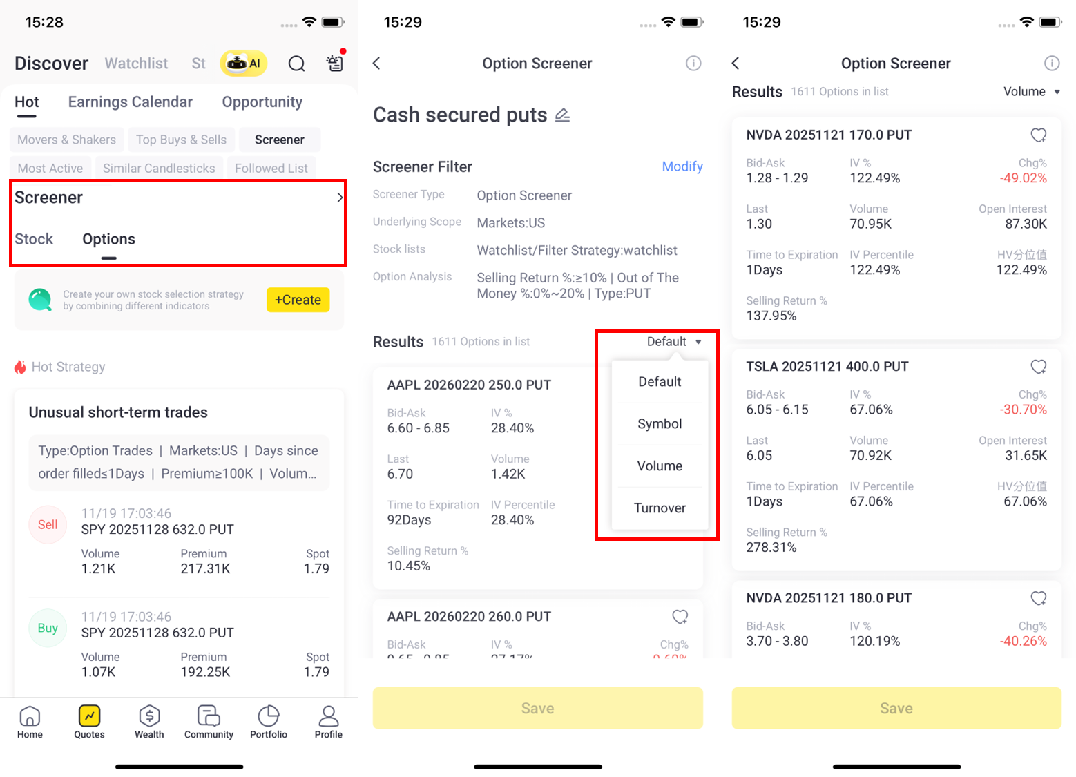 In such a market rhythm, no matter how volatile the market is, investors can optimize asset allocation through diversified tools. Option Screener is a highly efficient and reliable tool that allows investors to set a variety of filters and criteria, such as option type, expiration date, strike price, implied volatility, trading volume, and more. With the Option Screener, you can accurately capture options opportunities for targets like NVIDIA and calmly navigate the bull-bear game. Let’s see how it helps investors seize opportunities amid volatility~[Happy]