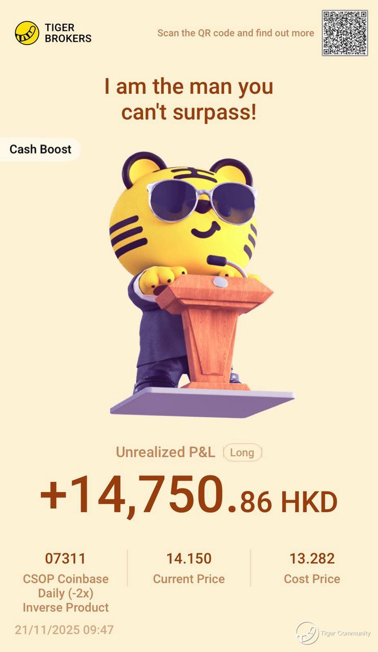 $CSOP Coinbase Daily (-2x) Inverse Product(07311)$ Perfectly timed the 07311 inverse play! Captured Coinbase's volatility just right. Holding and watching. The Contra688 boost was clutch - traded with extra confidence using those vouchers. Sweet timing!