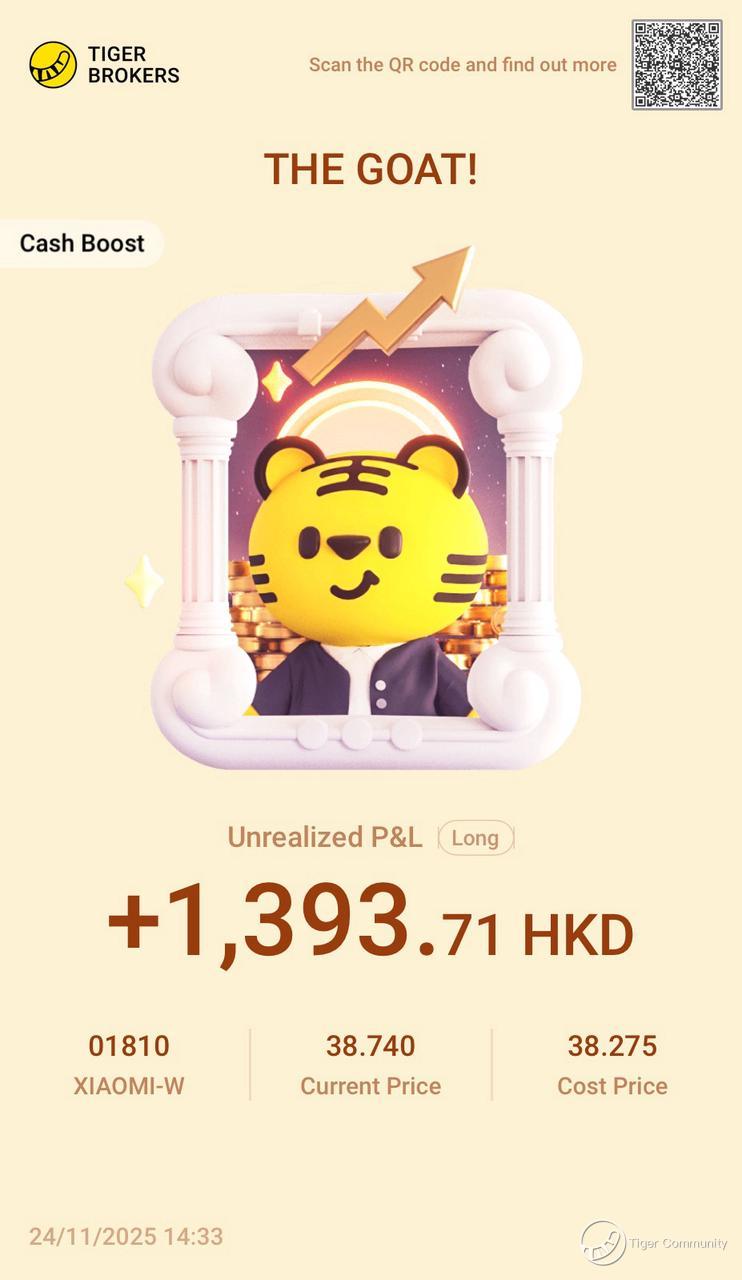 $XIAOMI-W(01810)$ Nice little gain on Xiaomi! Perfectly timed with the contra688 promo - used the free vouchers to average up, big shoutout for the rewards! Goldman just upgraded them, highlighting the AI narrative. Xiaomi's heavy R&D investment is solid, and I still see it as a high-growth play for the long run. Holding tight!