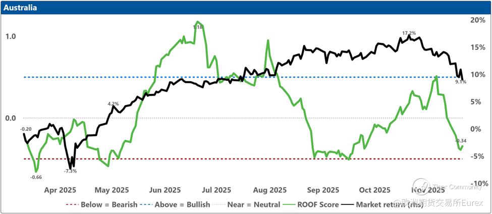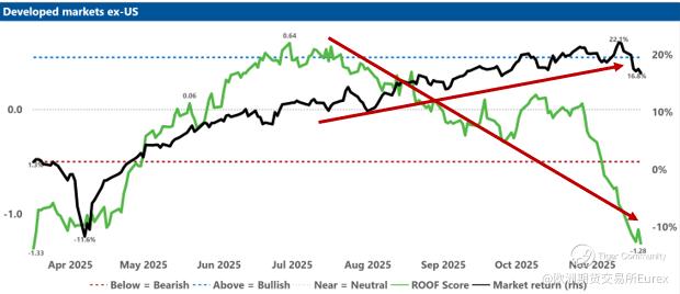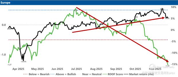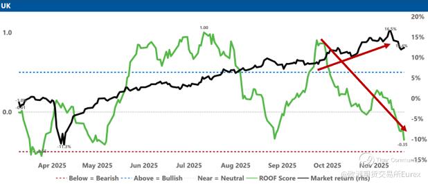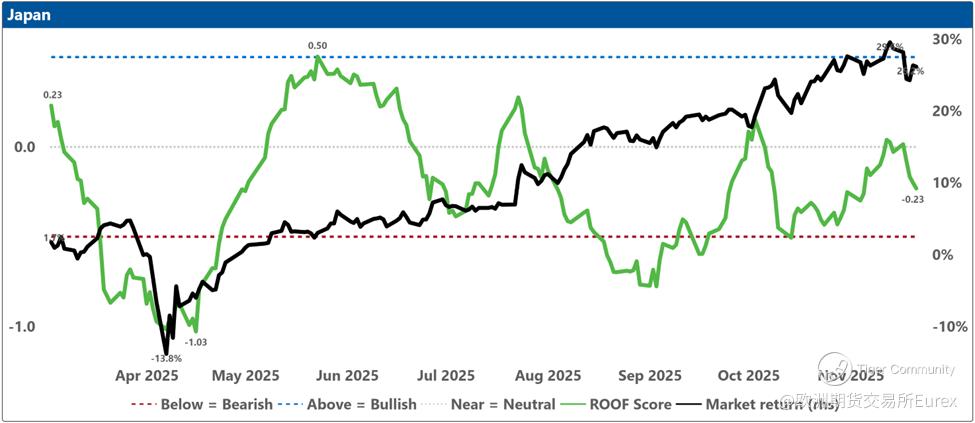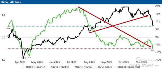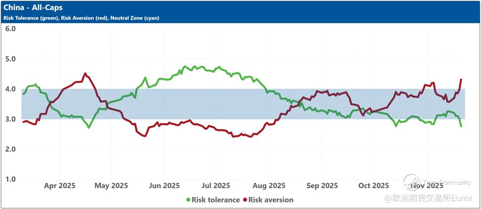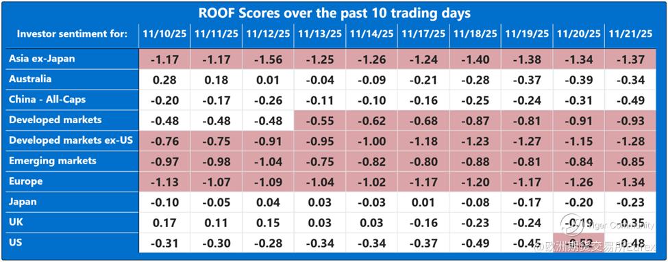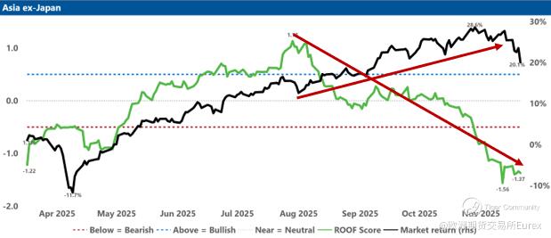 Investor sentiment continued to deteriorate last week, ending bearish across all five regional markets we track. Among individual markets, U.S. investors oscillated in and out of bearishness. In the U.K., sentiment dropped sharply from neutral to strongly negative ahead of this week’s Autumn Budget report. Japan shifted from neutral to negative as investors assessed the potential economic fallout from the new Prime Minister’s diplomatic clash with China. In China, sentiment weakened further on disappointing FDI data, closing on the cusp between negative and bearish. Overall, the imbalance between risk demand and supply is now deeply negative across most major markets, leaving them highly vulnerable to sharp downside overreactions if additional bad news emerges.