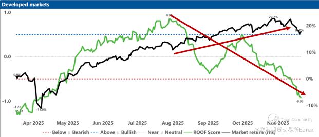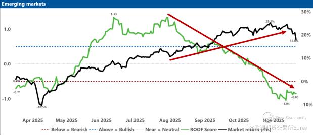 The top charts illustrate the ROOF ratio, which represents investor sentiment. This ratio is depicted in green on the left axis, while the cumulative returns of the underlying market are shown in black on the right axis. Key reference lines include: