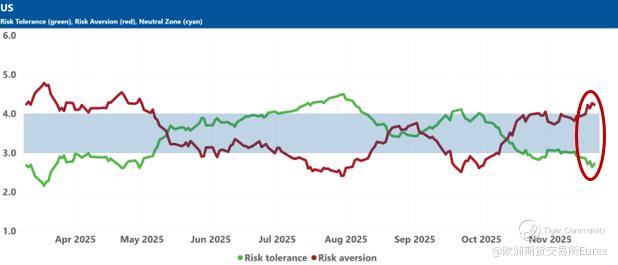 The bottom charts display the levels of risk tolerance (green line) and risk aversion (red line) within the market, representing investors' demand and supply for risk, respectively. Key insights include: