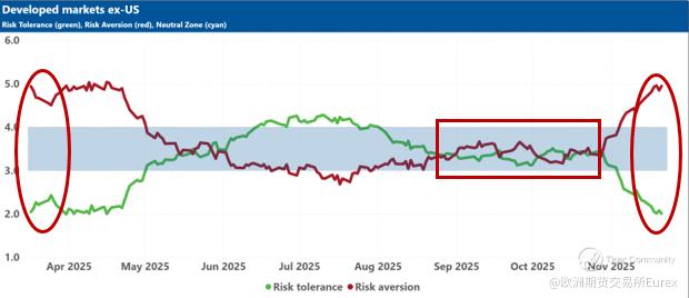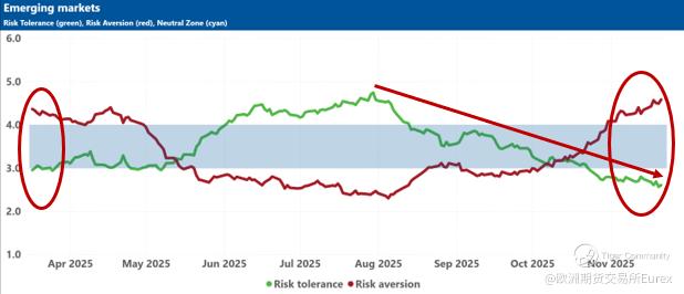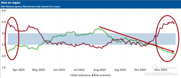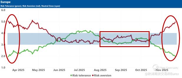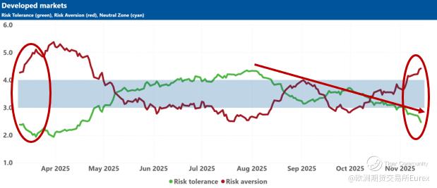 Conversely, when risk aversion (red line) surpasses risk tolerance (green line), the market dynamics reverse.