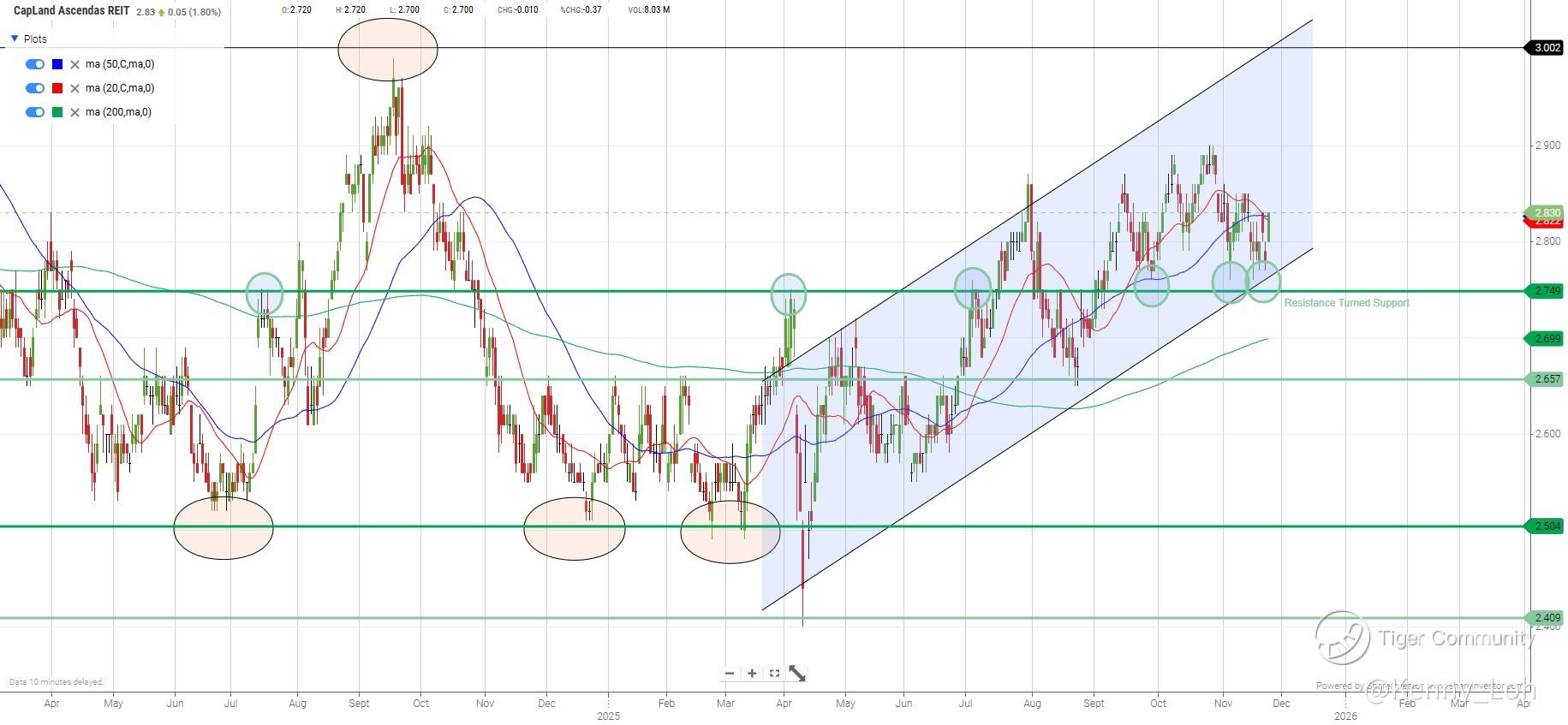 This chart for $CapLand Ascendas REIT(A17U.SI)$ shows the stock trading within an upward channel since mid-2025, indicating an uptrend.