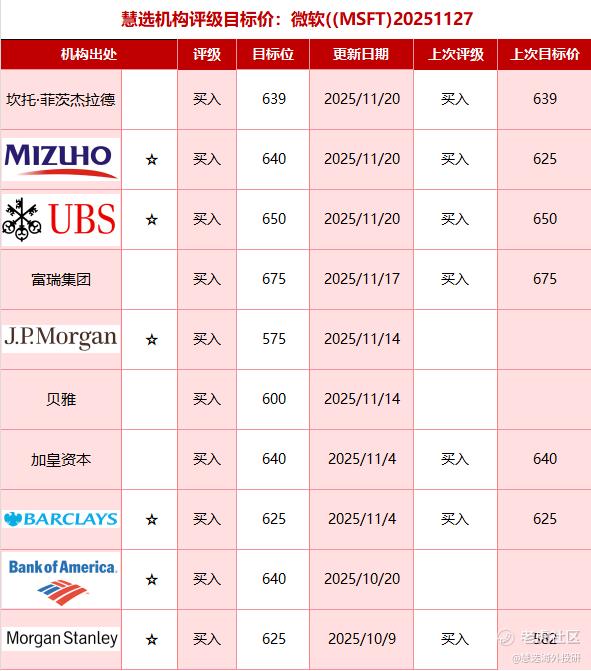 慧選機構評級目標價:微軟((MSFT)20251127