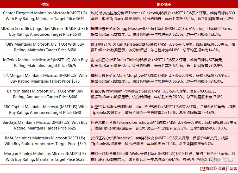 瑞穗證券分析師Gregg Moskowitz(牽頭微軟行業分析的團隊負責人)將微軟的目標價從625美元上調至640美元,維持“跑贏大市”(Overweight)評級。這一調整反映了該行對微軟在AI+雲協同效應下長期增長潛力的信心,認爲當前股價未充分反映其核心業務的增長動能。