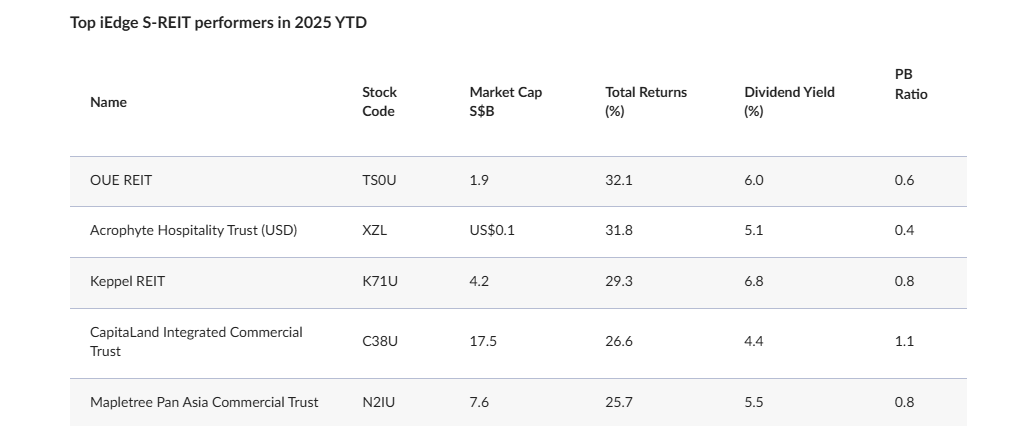 Of the 33 constituents in the iEdge S-REIT index, 29 have delivered positive total returns for the 2025 YTD, with the top 10 performers delivering over 20 per cent total returns.