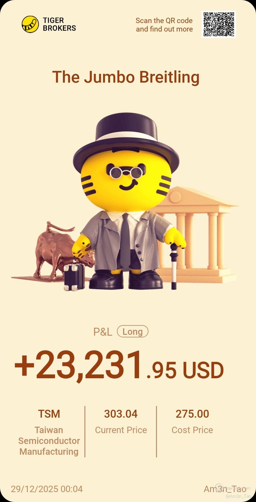 $Taiwan Semiconductor Manufacturing(TSM)$ a bit premium. sold off most of it for some meals, just holding a little bit. Expect growth in 2026 and will buy it again soon.