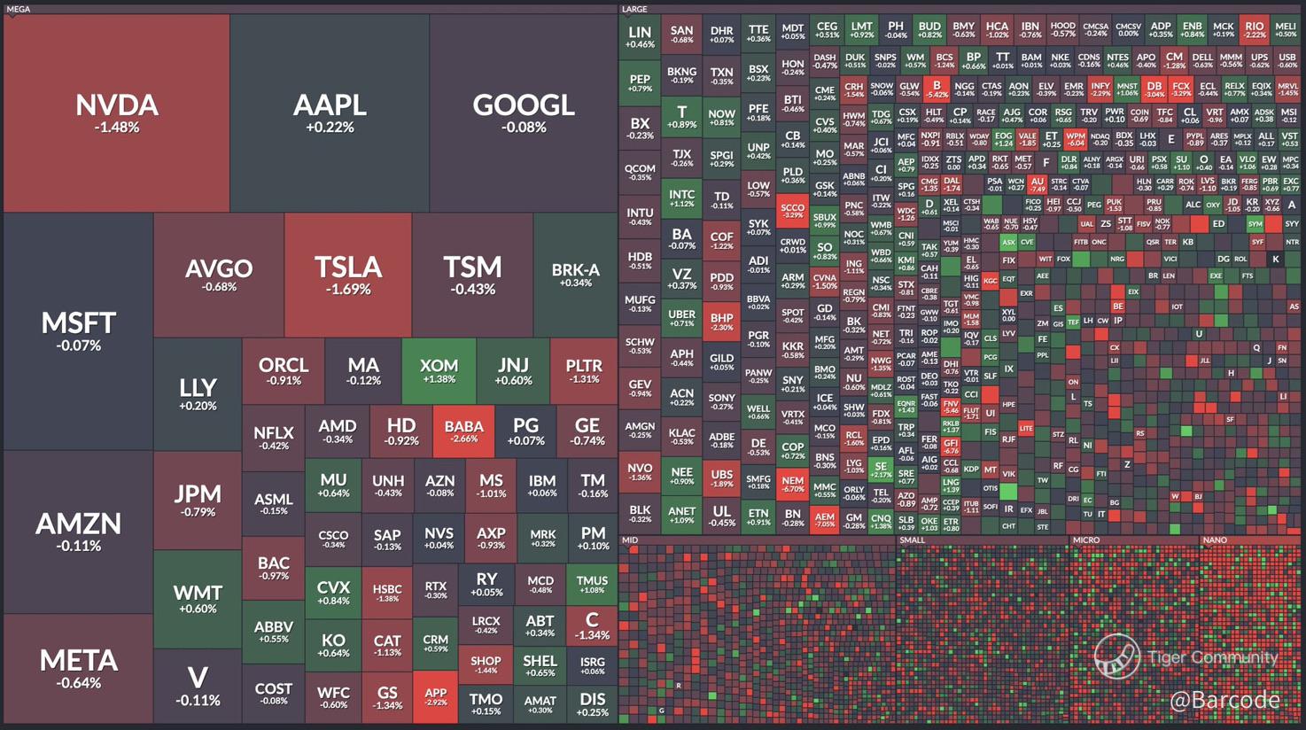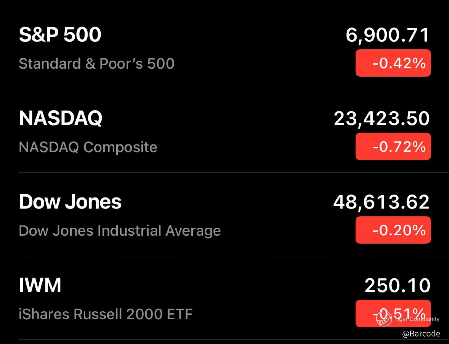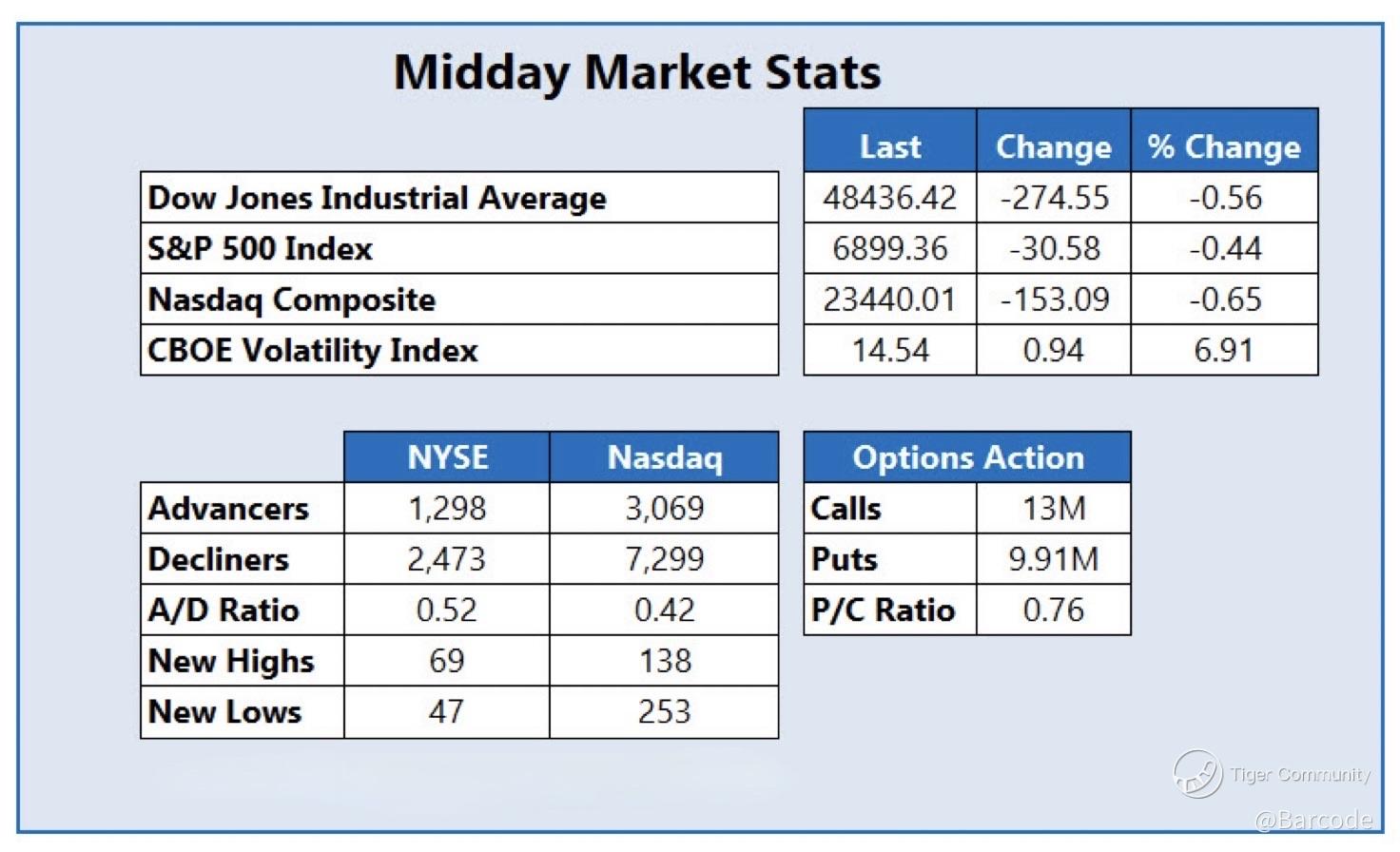 Midday Check: Iโm watching the Santa Claus rally clearly fade as the final week of 2025 opens with disciplined profit taking across the Street. $DJI and $IXIC are both down more than 150 points midday, $SPX is lower by roughly 0.44%, and volatility is finally repricing, with $VIX up nearly 7% and tracking its largest one-day pop since 08Dec. Market internals confirm the tone, NYSE and Nasdaq decliners are firmly in control, A D ratios sit near 0.52 and 0.42, and new lows are expanding faster than new highs. Tech, gold and silver are all leaning lower in a coordinated risk unwind, while options flow remains call heavy with a 0.76 P C ratio, suggesting complacency is being tested rather than broken. I see this as a controlled reset into year end positioning, not panic, with liquidity thinning and desks locking in a very strong 2025.