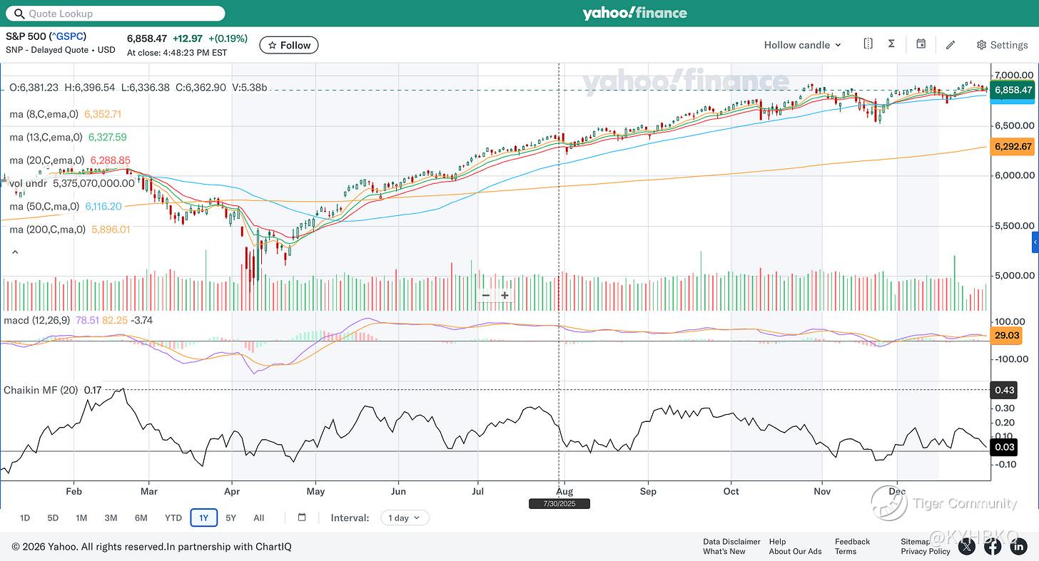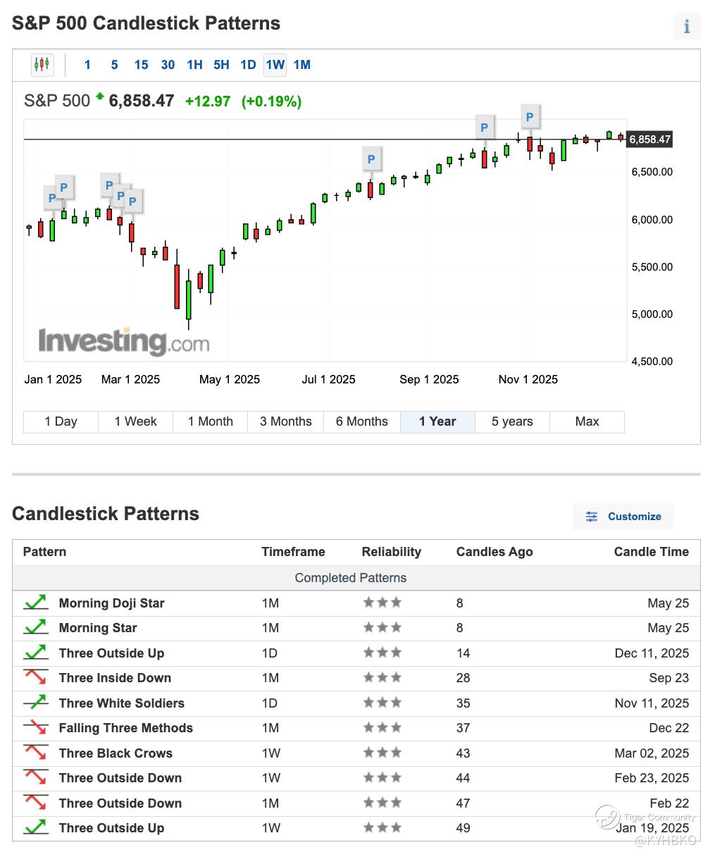 Mildly bullish with consolidation likely. Recent high-reliability daily/weekly bullish patterns (Three Outside Up on Dec 11, 2025; Three White Soldiers on Nov 11, 2025) support buyer control, but smaller-bodied candles near all-time highs signal slowing momentum and indecision. Expect sideways trading or a shallow pullback toward 6,500–6,600 support before resuming upward. Risk of deeper correction only if clear bearish reversal forms.