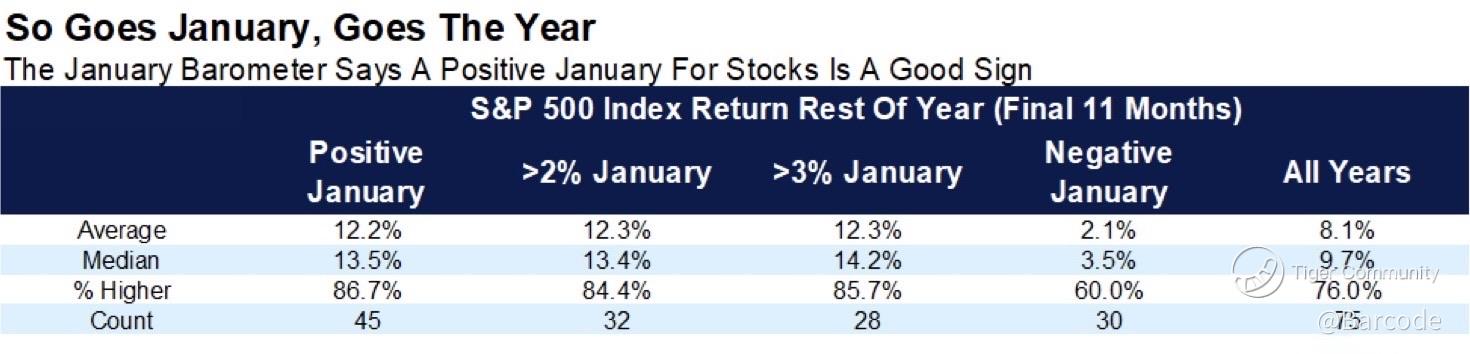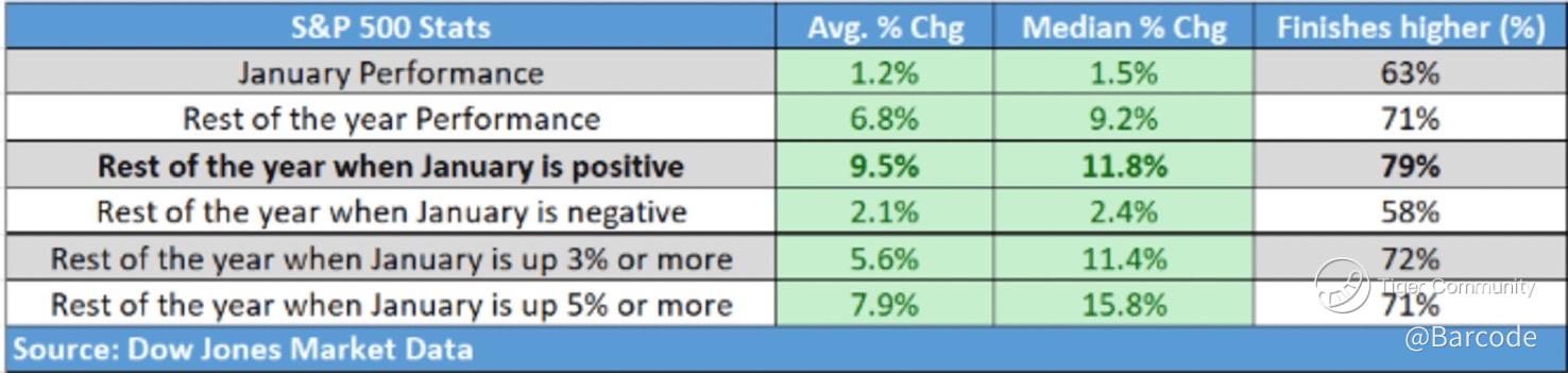 January itself averages +1.2%, with a +1.5% median, finishing higher 63% of the time. When January closes positive, the S&P 500 finishes the year higher 79% of the time, with the remainder of the year averaging +9.5% and a +11.8% median. When January is negative, forward outcomes compress sharply.