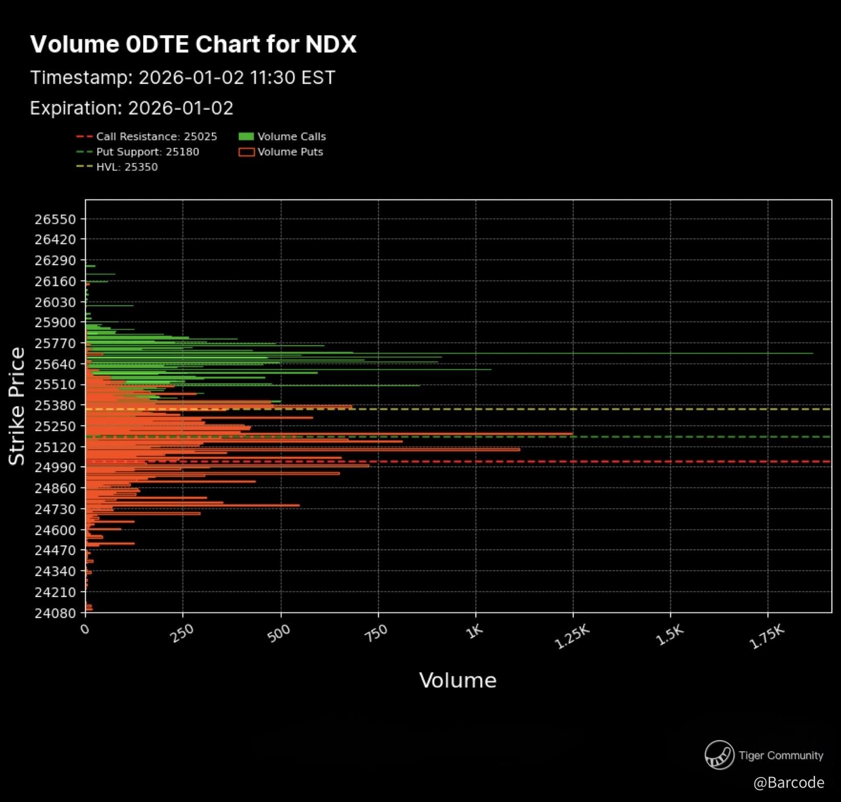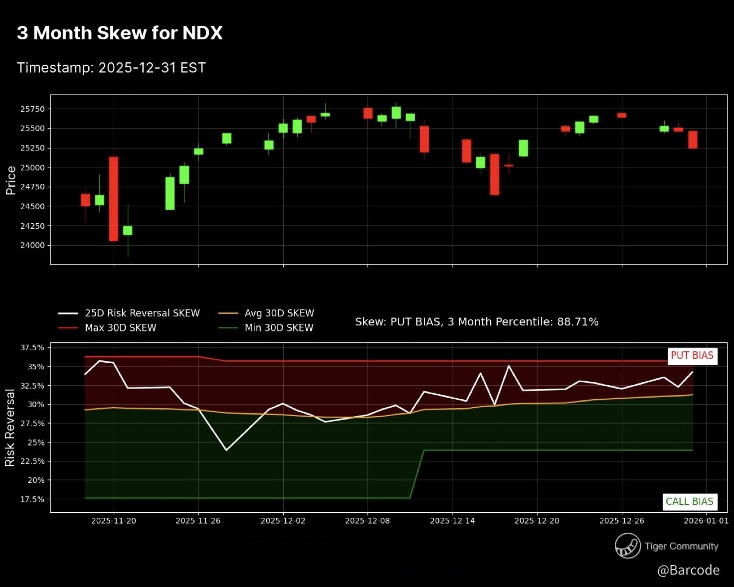 In contrast, NDX skew has rotated decisively toward puts. Put volume dominated the most recent session, signalling growth-specific hedging rather than wholesale risk-off behaviour. This divergence supports rotation, not collapse.