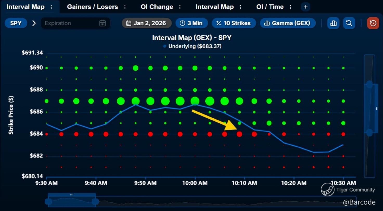 On SPY, $684 is structurally pivotal. Gamma exposure flagged $687 as a rejection band, while negative exposure began building near $684 late last week. A clean dark pool print at $680.01 triggered an immediate liquidity response, followed by a rebound toward $683.05. That reaction confirmed real demand, not coincidence.