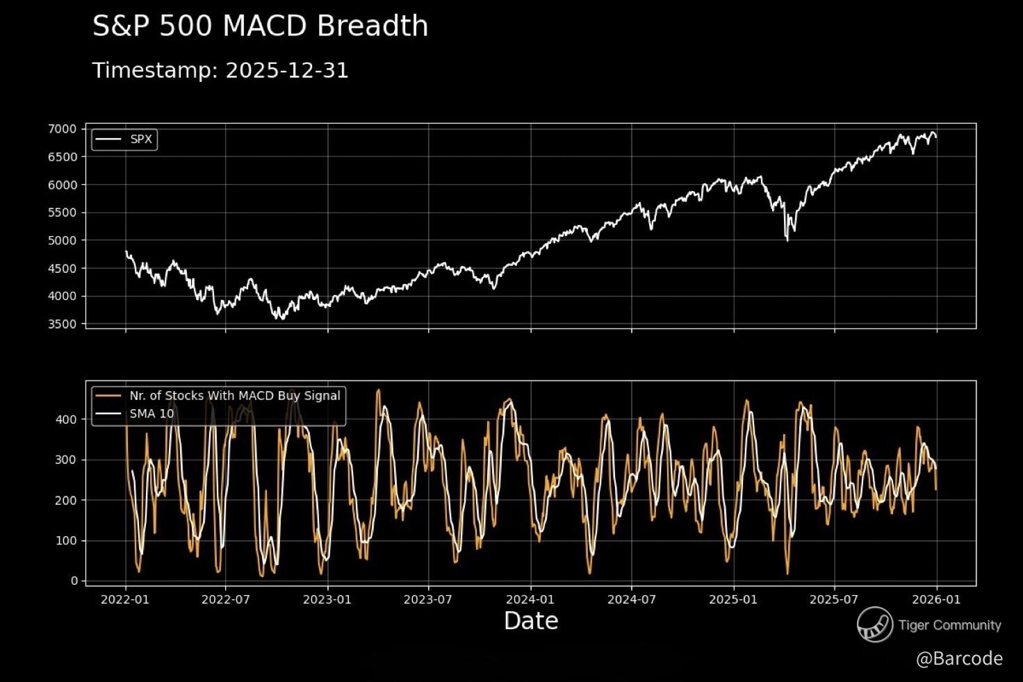 Price continues to advance while MACD breadth buy signals are fading, a classic late-trend stretch dynamic. This is not bearish by default. It reflects dispersion and selective leadership, which is precisely what Russell 2000 outperformance is confirming.