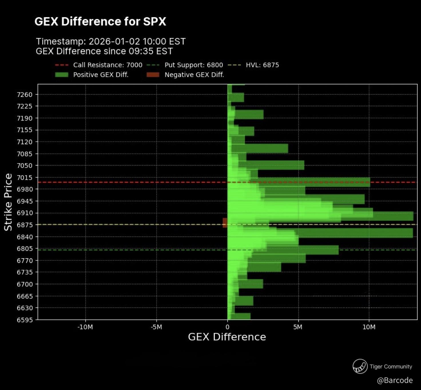 Gamma exposure remains the dominant stabiliser. Strong positive GEX continues to dampen volatility and compress intraday ranges in SPX. As long as dealers remain net long gamma, dips are mechanically supported rather than accelerated.
