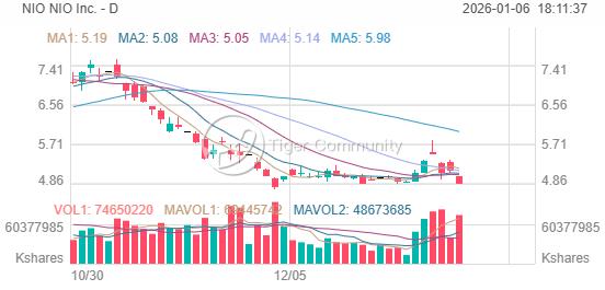 NIO closed at $4.86 on Jan 6, 2026, down -5.45%. The stock is now 39.4% below its 52-week high of $8.02.