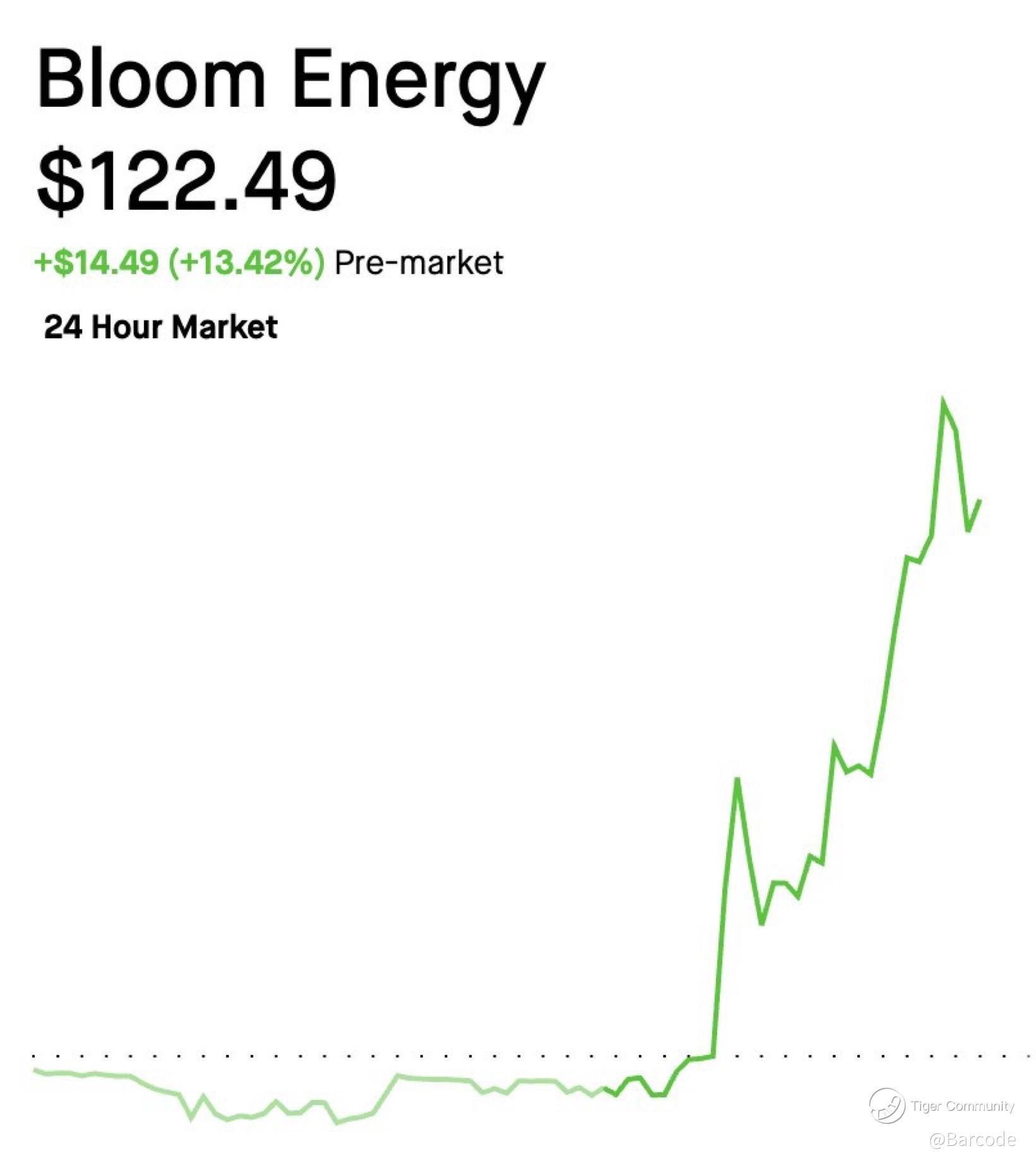 Bloom Energy was already ripping premarket, up as much as +15%, following a $2.65B fuel cell deal with American Electric Power. The structure matters. A 20-year offtake for 100% of output at a planned Wyoming site, plus AEP exercising an option that lifts total capacity to 1000MW. That is contracted, dispatchable power with long-duration visibility, not speculative AI hype.