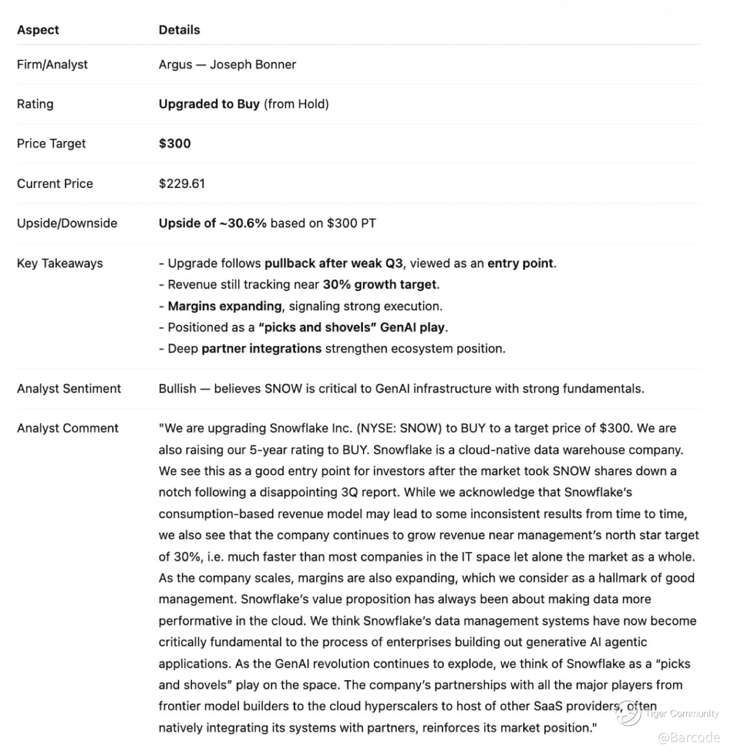 🚨📰 JUST IN: $SNOW 🟢 Argus upgrades to BUY | PT $300