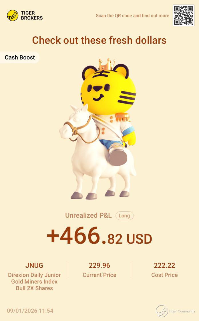 $Direxion Daily Junior Gold Miners Index Bull 2X Shares(JNUG)$ This run on JNUG has been wild! Riding the strength in gold and junior gold miners, this leveraged ETF swings big and the profits have definitely hit nicely. High risk, but catching the move felt profitable!