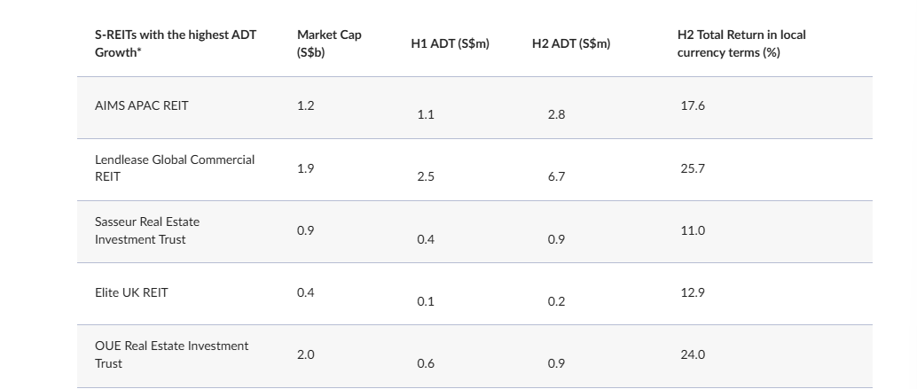 Excluding the new listings, ADTV for the sector was relatively stable, even though several mid-cap Reits saw liquidity surge in H2. The S-Reits that had ADTV rise the most in H2 included Aims Apac Reit : O5RU 0%, Lendlease Global Commercial Reit : JYEU 0% (LReit), Sasseur Reit : CRPU +0.74%, OUE Reit : TS0U -1.37% and Elite UK Reit : MXNU 0%.
