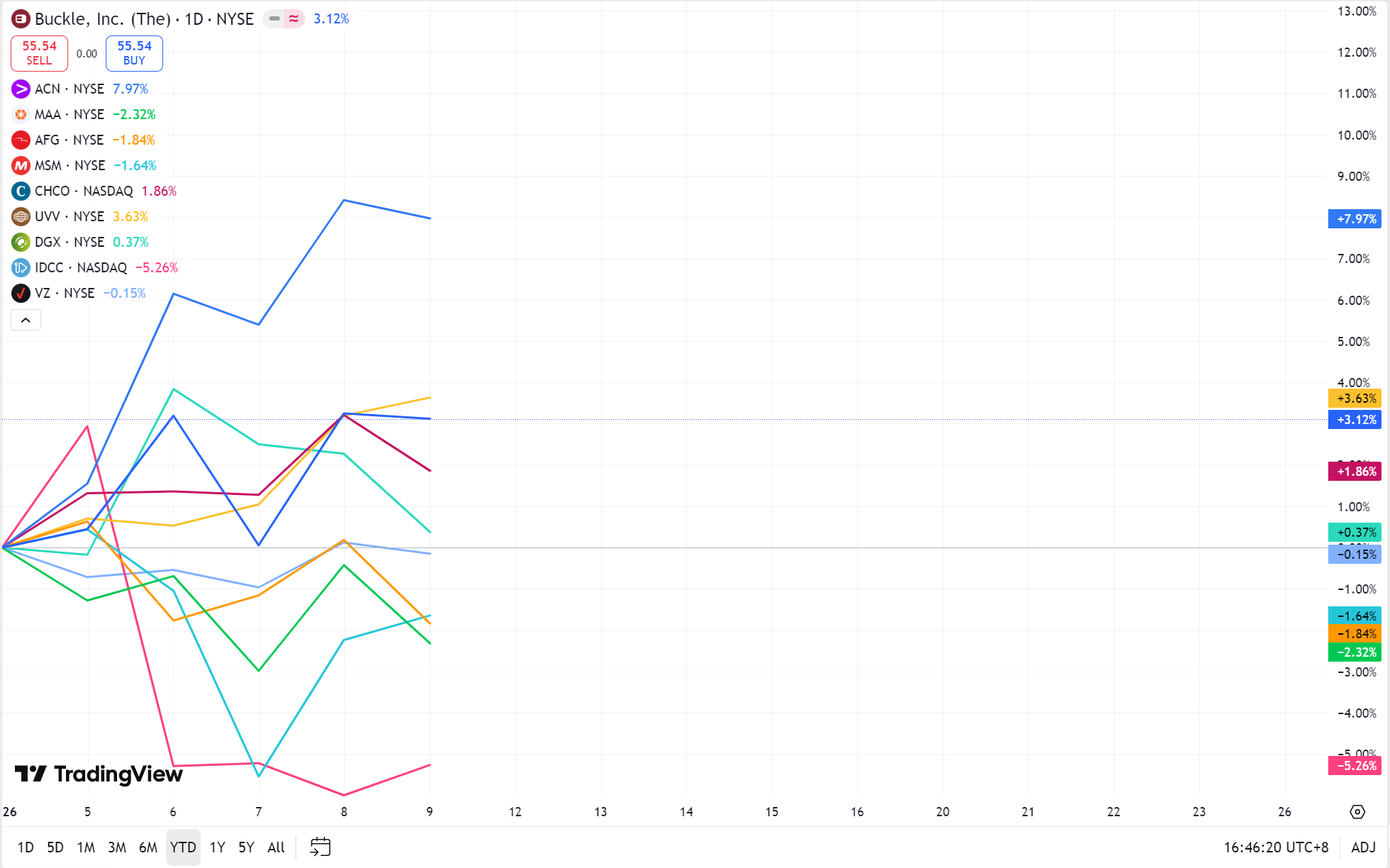 Based on TradingView’s 2026 data, $Buckle(BKE)$ , $Accenture PLC(ACN)$ , $City(CHCO)$ , $Universal(UVV)$ , and $Quest Diagnostics(DGX)$ posted gains, whereas $Mid-America Apartment Communities(MAA)$ , $American(AFG)$ , $MSC Industrial Direct(MSM)$ , $InterDigital(IDCC)$ , and $Verizon(VZ)$ recorded declines.