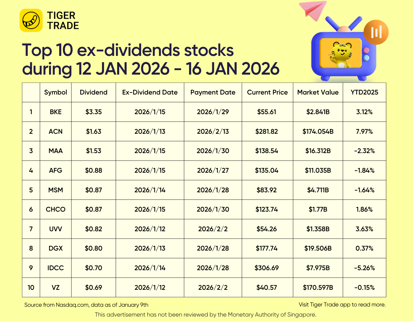🎁Capturing Top 10 Ex_dividend: BKE, ACN, MAA, AFG, MSM...