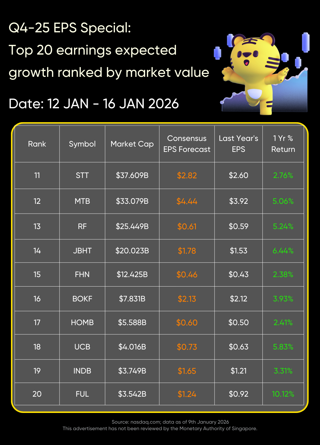 On January 12 to January 16, $Taiwan Semiconductor Manufacturing(TSM)$ , $JPMorgan Chase(JPM)$ , $Bank of America(BAC)$ , $Wells Fargo(WFC)$ , $Morgan Stanley(MS)$ , $Citigroup(C)$ , $BlackRock(BLK)$ , $PNC Financial Services Group Inc(PNC)$ , $Bank of New York Mellon(BK)$ , $Infosys(INFY)$ , $State(STT)$ , $M&T Bank(MTB)$ , $Regions(RF)$ , $JB Hunt Transport(JBHT)$ , $First Horizon National(FHN)$ , $BOK Financial Corp(BOKF)$ , $Home BancShares(HOMB)$ , $United Community Banks(UCB)$ , $Independent Bank(INDB)$ , and $H.B. Fuller(FUL)$ are expected to release their earnings, and consensus earnings per share forecasts are higher than data from the same period last year.