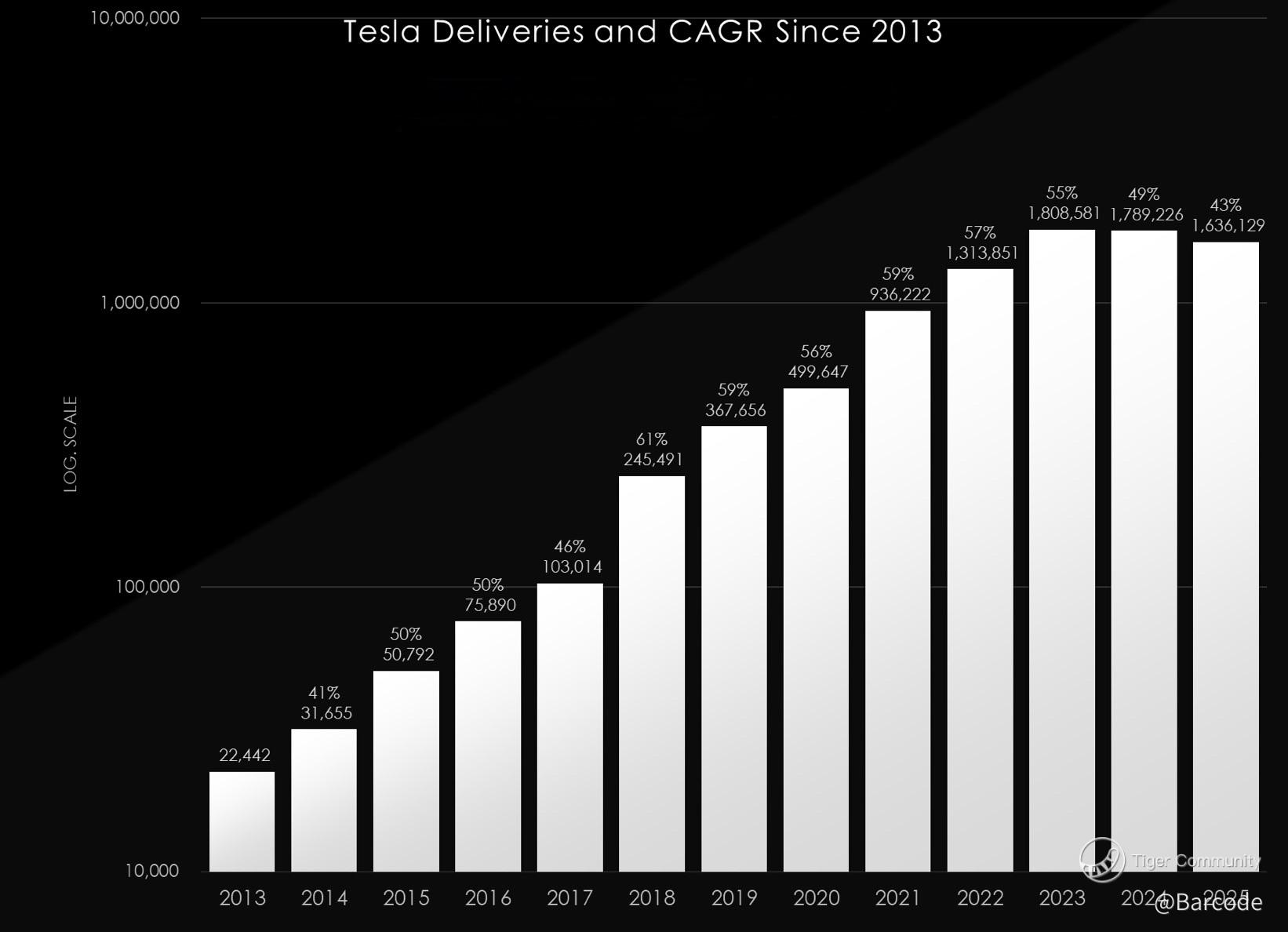 Tesla’s 2025 deliveries reached 1,636,129 units, reducing its 12-year compound annual growth rate to an eleven-year low of 43%, still among the fastest-scaling industrial and technology companies globally. Analyst trajectories point toward ~2M units in 2027 and ~3M by 2029 as Cybertruck and new platforms ramp. Energy adds torque, with record 46.7 GWh deployed in 2025 on Megapack demand.