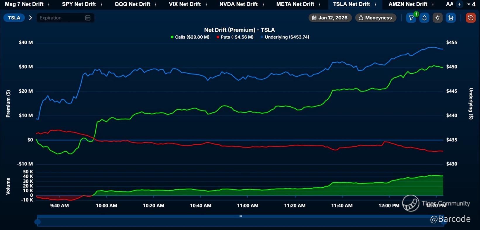 Monday’s open saw $TSLA print a new high of the day as $30M+ in net short-dated, single-leg call premium hit the tape. That is real-time bullish flow pushing momentum and liquidity through the $450 zone as Bulls assert control.