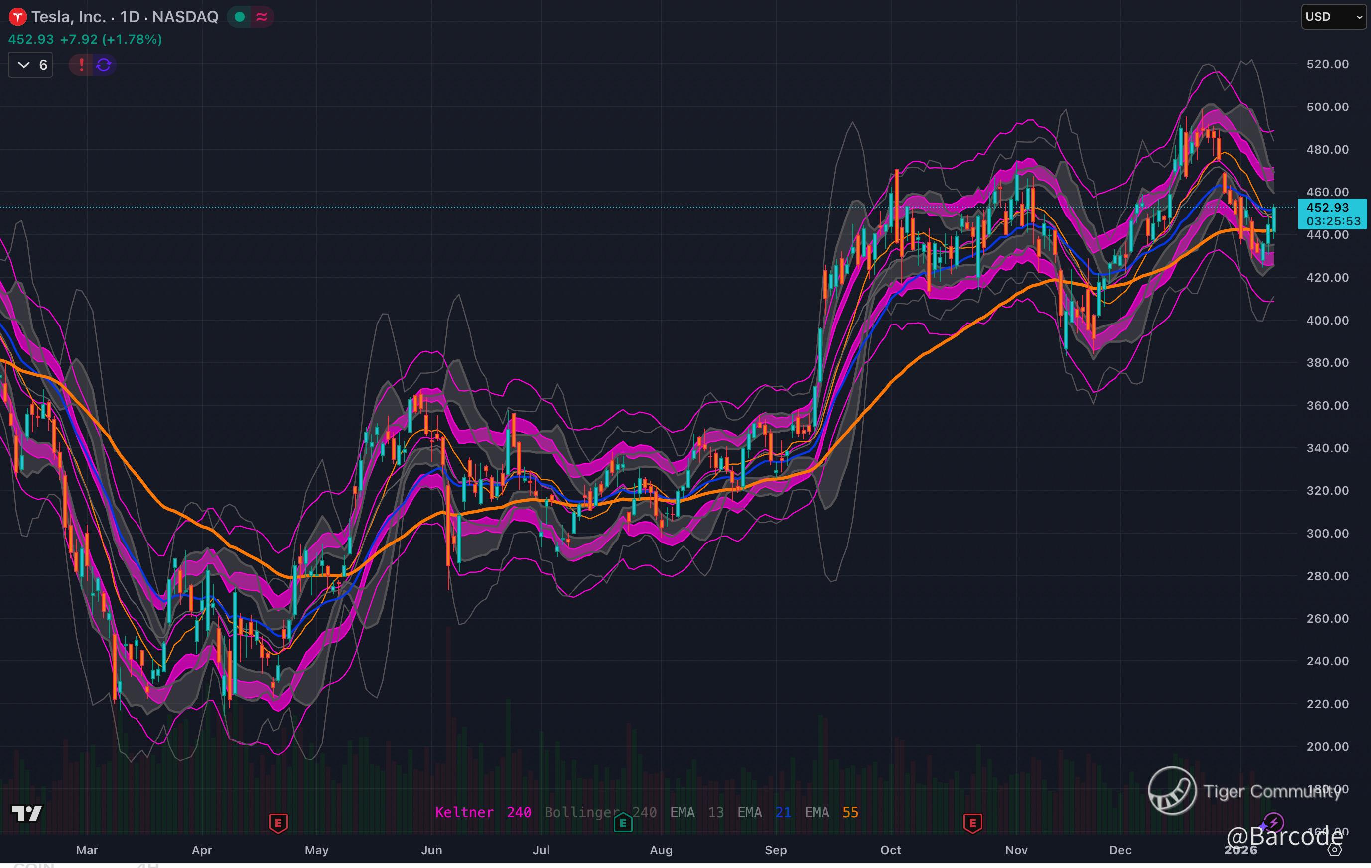 With $30M+ call flow, a live inverse head and shoulders, Cybercab ramp, FSD V14.2 reasoning upgrades and the 10B-mile autonomy milestone converging, the setup favours upside into earnings unless $453.60 fails.