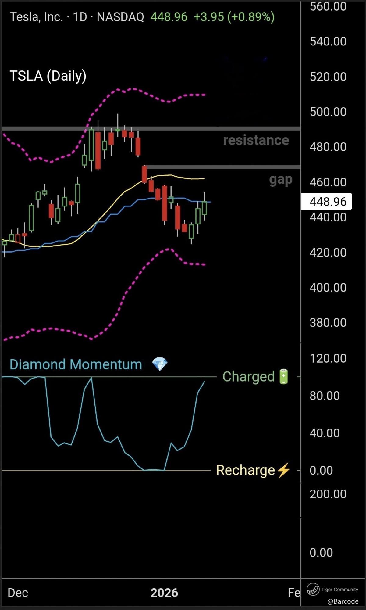 $Tesla Motors(TSLA)$ $Direxion Daily TSLA Bull 2X Shares(TSLL)$ $NVIDIA(NVDA)$ 💎🚗⚡📊 $TSLA is printing higher lows off Thursday’s flush while reclaiming the medium-term moving average 🟠, signalling a regime shift back into accumulation. Price is compressing inside a defined liquidity pocket as realised volatility fades, setting up a volatility expansion. The next upside magnet sits at the short-term moving average 🟢 and the $460 gap zone, where dealer gamma flips supportive.