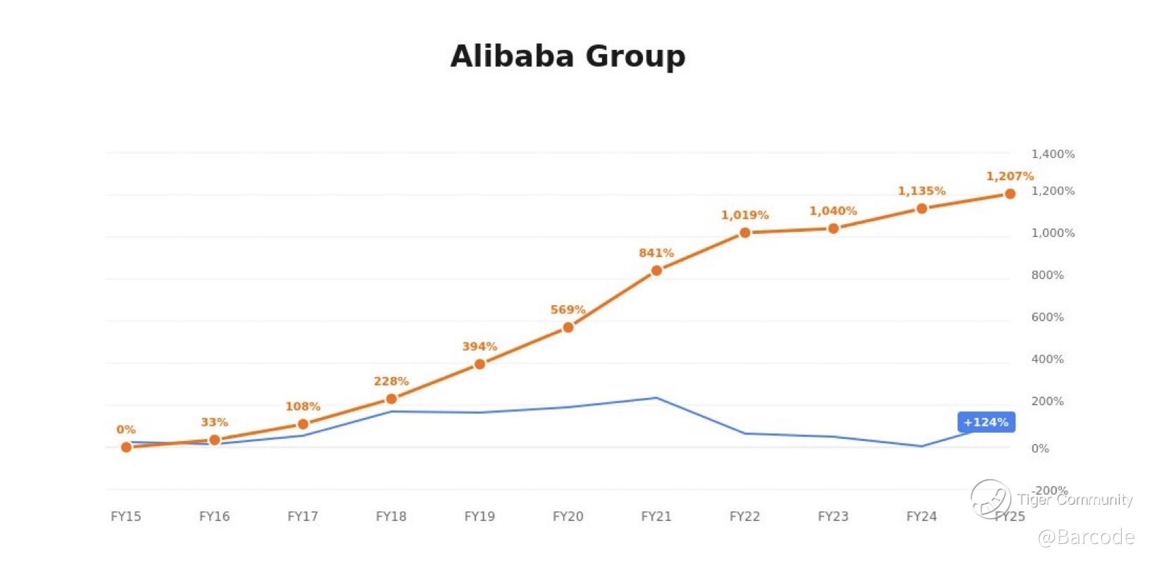$BABA is now sitting on one of the largest revenue-price dislocations in global equities. Revenue has compounded over 1,200% since FY15, while the stock is up barely +124%. That gap is not noise, it is a valuation vacuum that options markets are now positioning against.