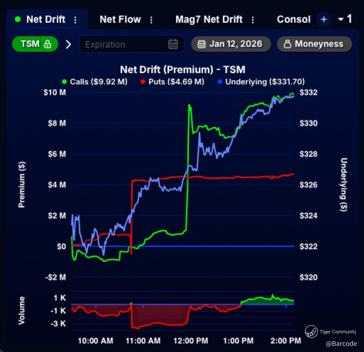 $SMCI showed near-even calls and puts at 450k contracts, a sign of volatility structuring rather than outright direction.