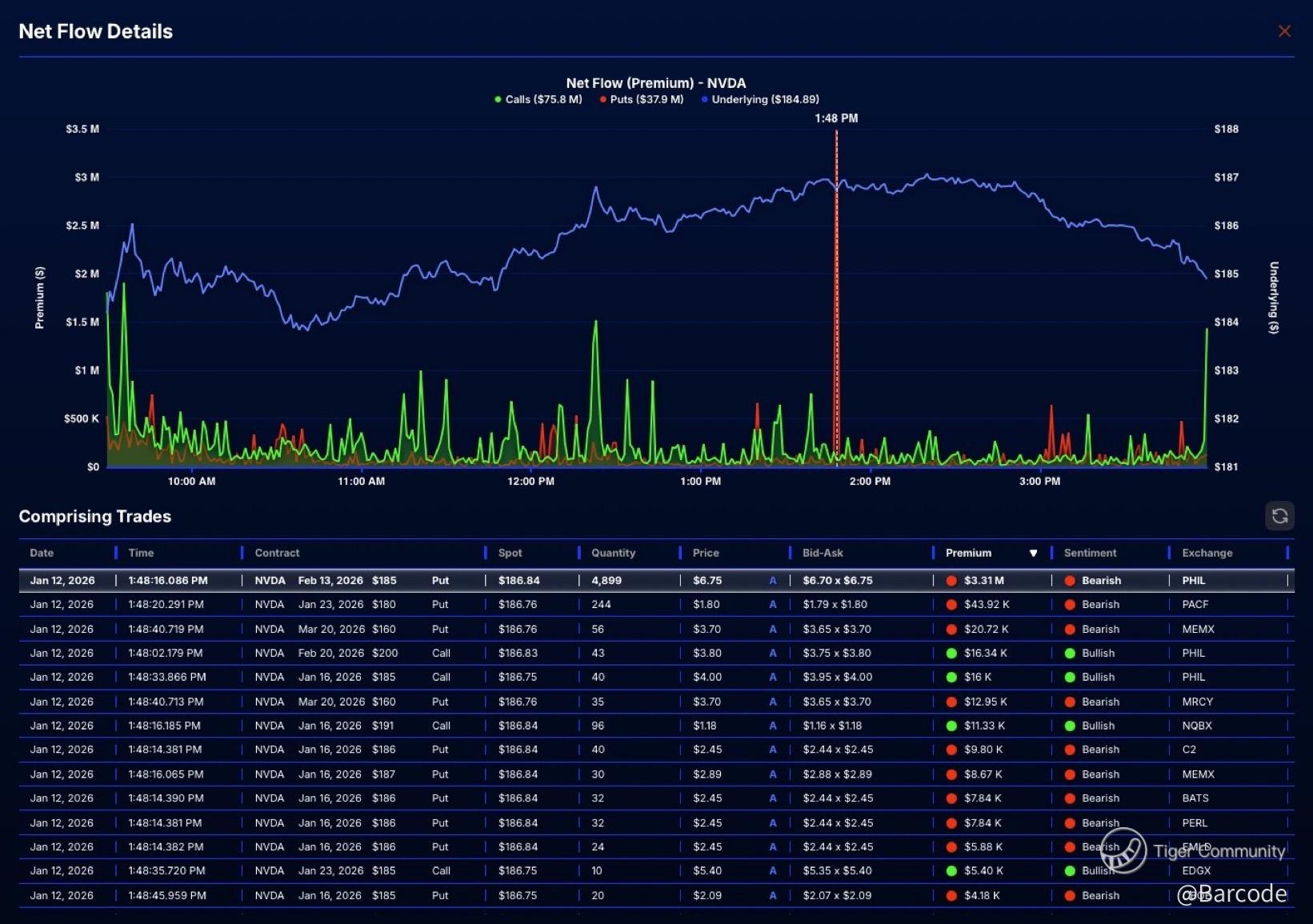 Under the surface, hedging stress showed up late. $NVDA saw a $3.31M opening 13Feb $185 put sweep at 1:48pm, just as price stalled near $187โ188, defining a near term gamma shelf and downside liquidity pocket. If spot drifts toward $185, dealer hedging flips from support to acceleration.