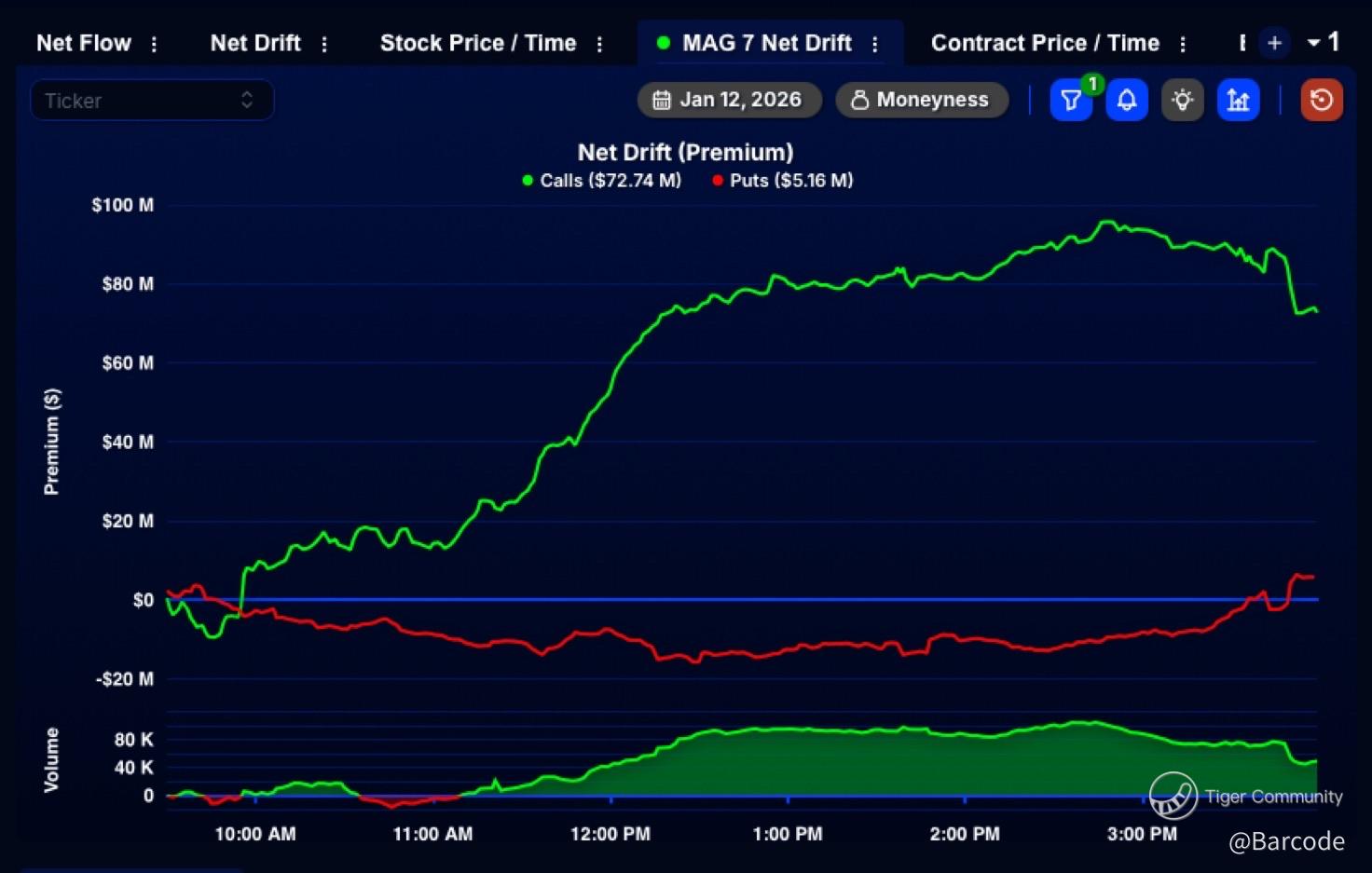 Todayโs tape printed a textbook institutional imbalance across the MAG 7 complex. Net call premium ripped to $72.7M versus just $5.1M in puts, forcing dealers into long gamma and long delta hedging as spot trended higher. That flow profile creates upside pinning, reduced realised volatility, and positive vanna feedback as call OI builds above spot.