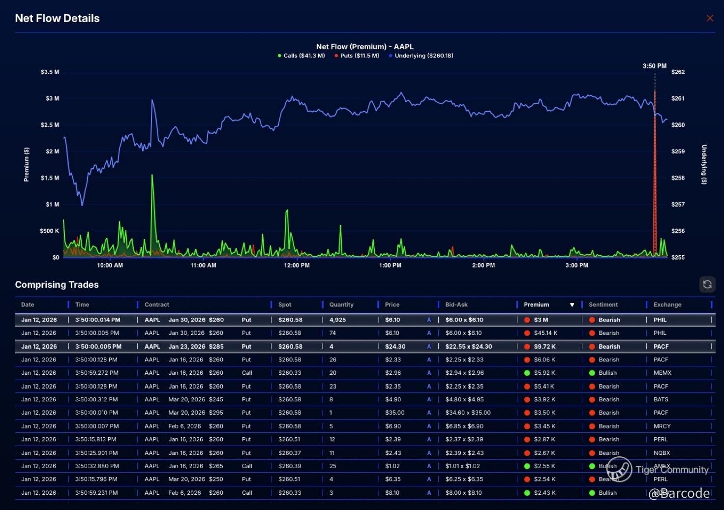 $AAPL printed a $3M opening 30Jan $260 ATM put, tagging the key gamma magnet at $260 into the close. That strike now sits at the centre of dealer exposure, acting as a volatility pin unless spot breaks.