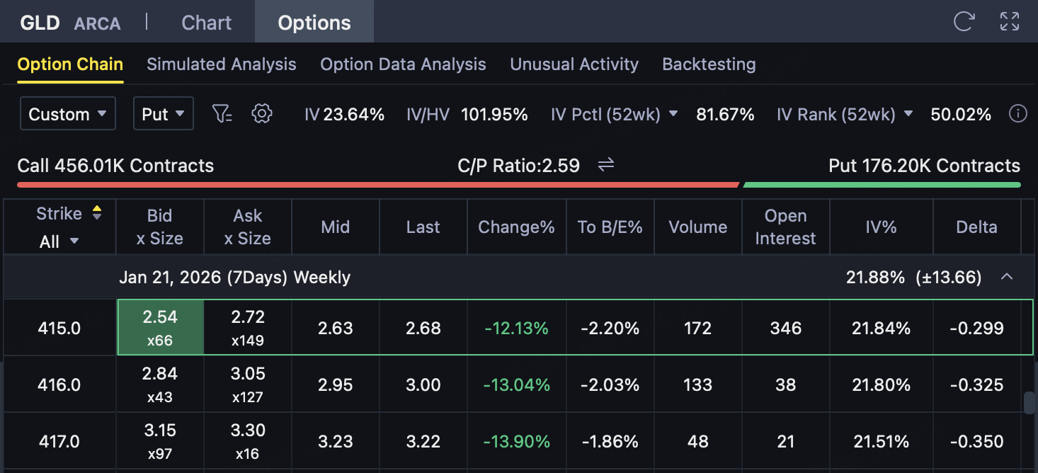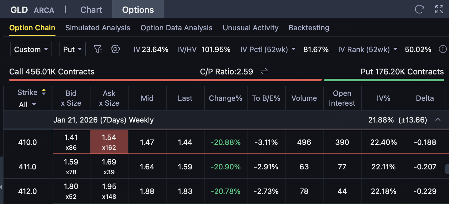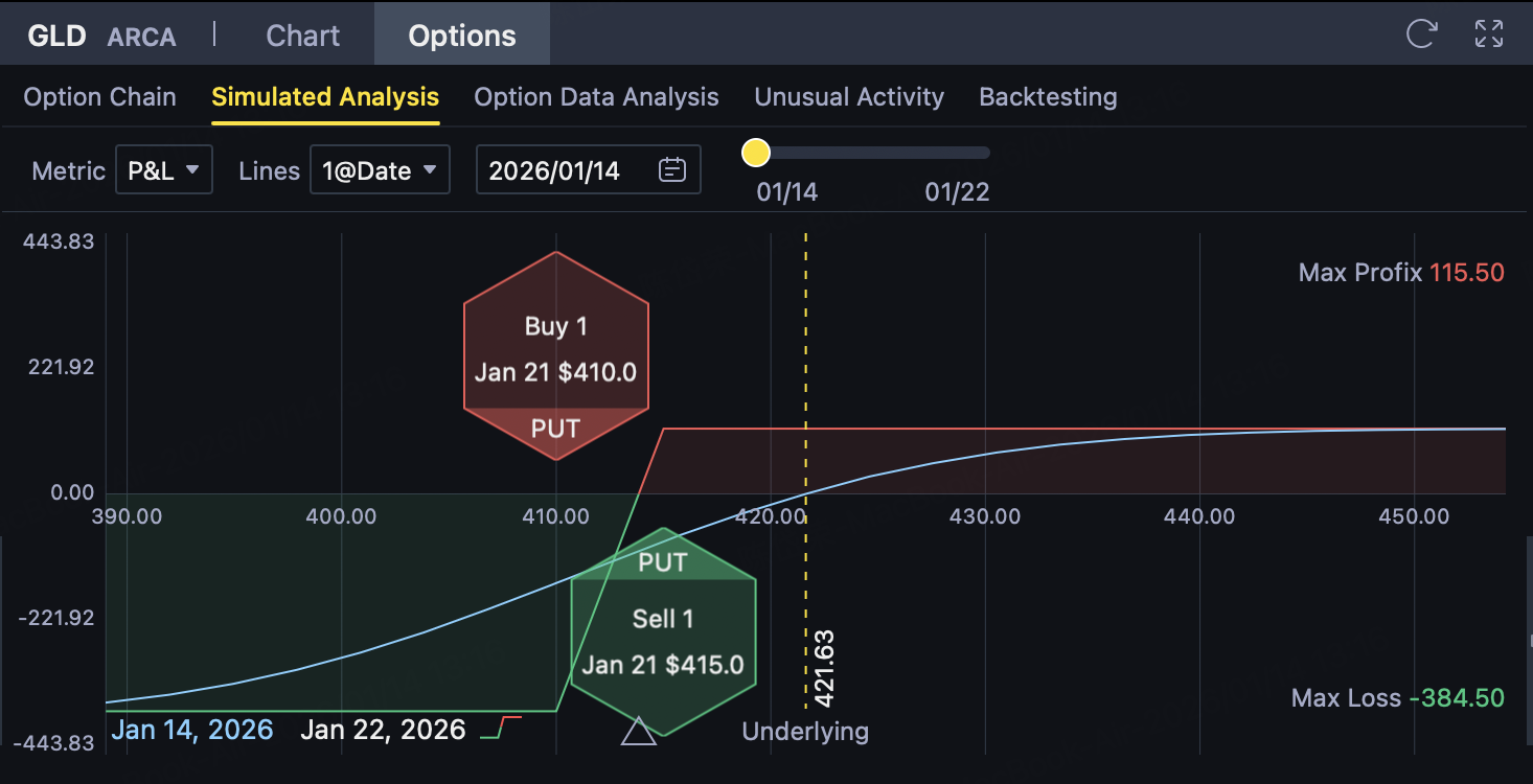 (2) Buy a lower strike price Put (risk protection) Investors buy one strike price at the same timeK ₁ = 410Put options, pay premium$1.44。 This Put is used to limit the maximum loss in case of an unexpected decline in GLD, so that the risk of the overall strategy is strictly capped.