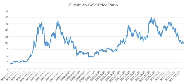 From the perspective of the Bitcoin-to-gold ratio, the current level stands at around 20.6x, well below the peak range of 35–40x, potentially signaling that Bitcoin still has meaningful upside room ahead.