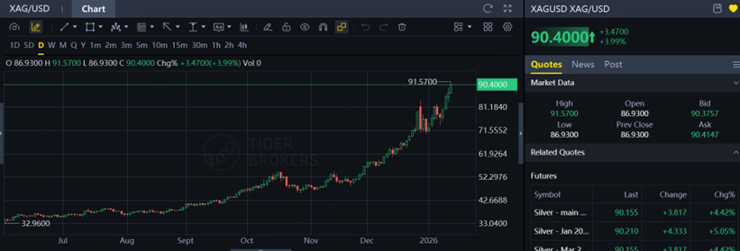 Silver has been even more aggressive, surging over 3.8% today, breaking above the USD 90 level and printing a new record high.