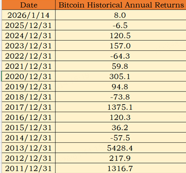 From a historical perspective, Bitcoin has never posted declines for two consecutive years. Last year, however, Bitcoin fell 6.5%, underperforming most major asset classes—setting the stage for a potential rebound year ahead.