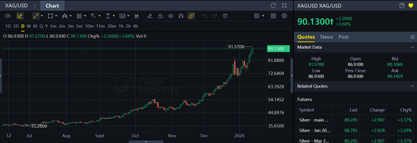 Silver has gone on an absolute tear, surging over 5% intraday today, breaking decisively above the key $90 psychological level and reaching an intraday high of $91.57.
