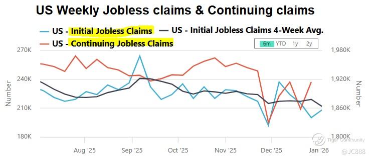 For week ending 03 Jan 2026, US weekly jobless claims rose by +8,000 to 208,000.