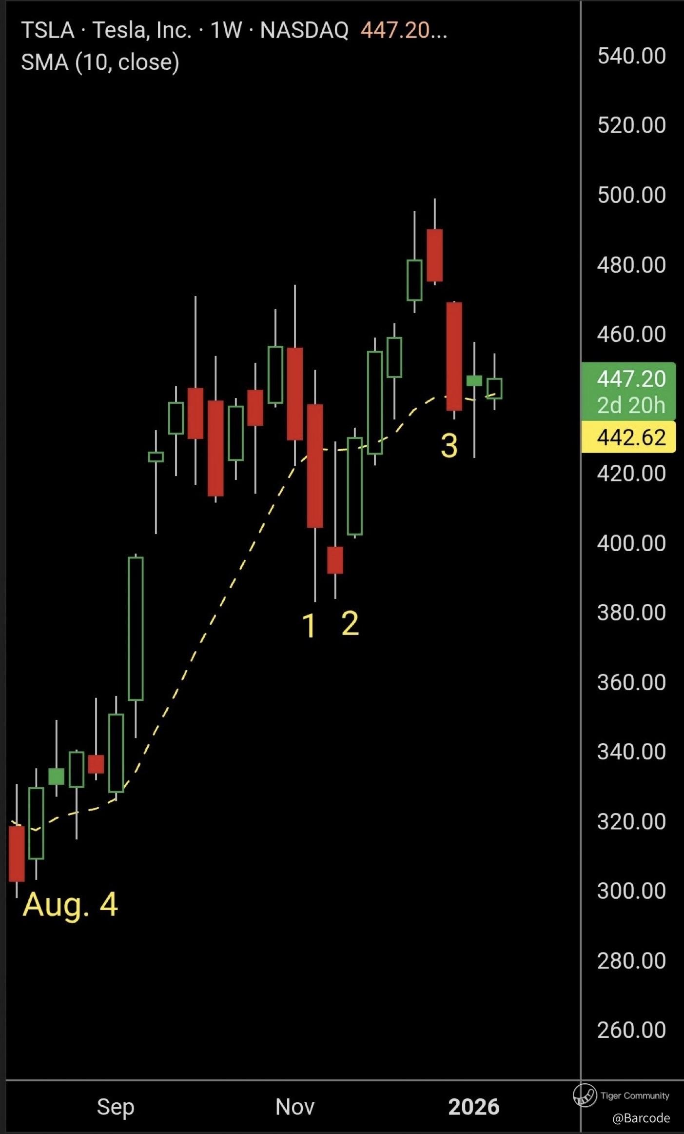 $TSLA is pinned near $447 after rejecting the 21-day EMA at $442.6 with CVD slightly negative, but weekly structure still holds above the rising trendline and the 10-week SMA, which has only failed three times since August. That defines this as compression inside trend, not distribution.
